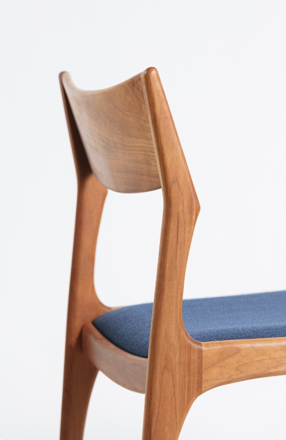 チェリー無垢材から手仕事で削り出された彫刻のような肘掛けが、肘から手首までの間に気持ちよくフィットします。