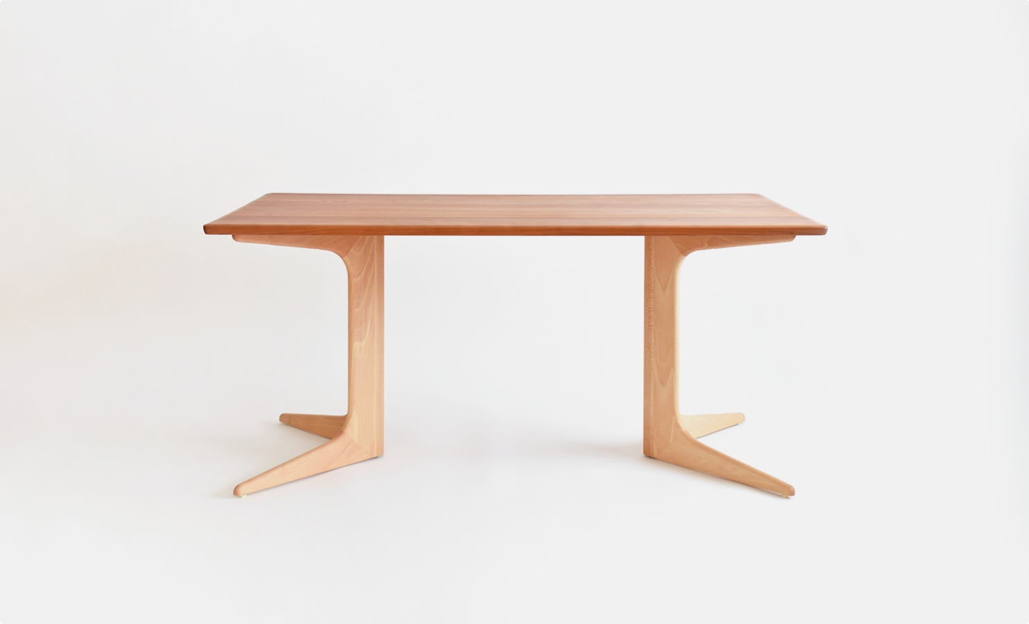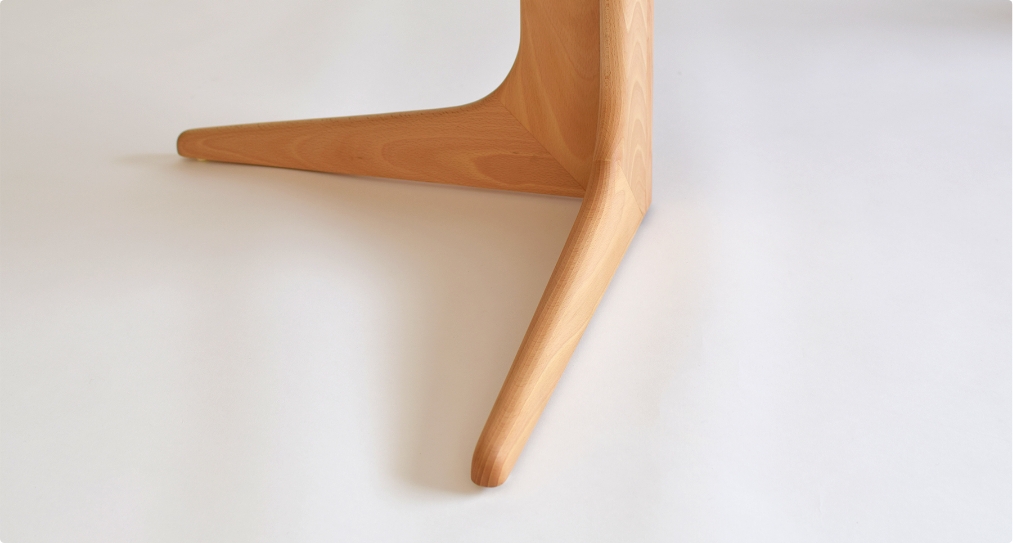 全体的にまるく角を落とし、Vの字に伸びた脚先に向けて傾斜を描くことで、やわらかな表情に仕上げました。