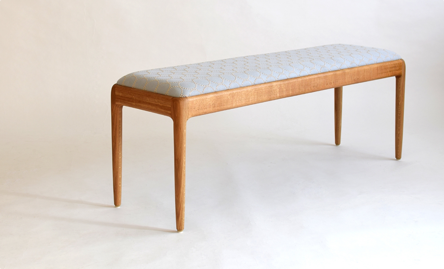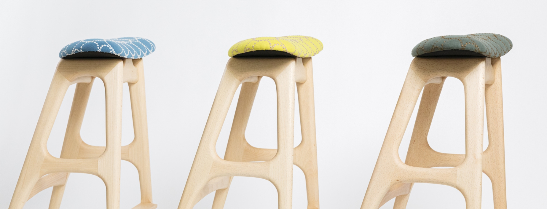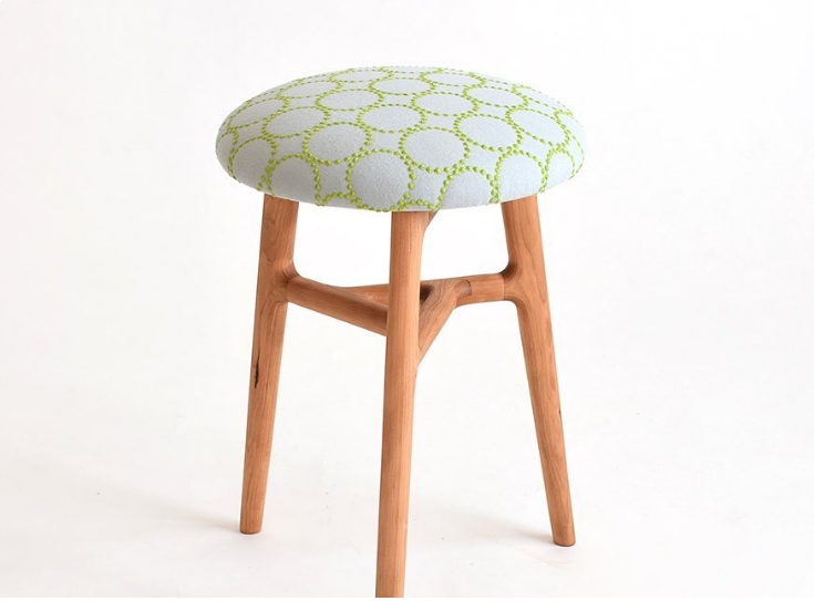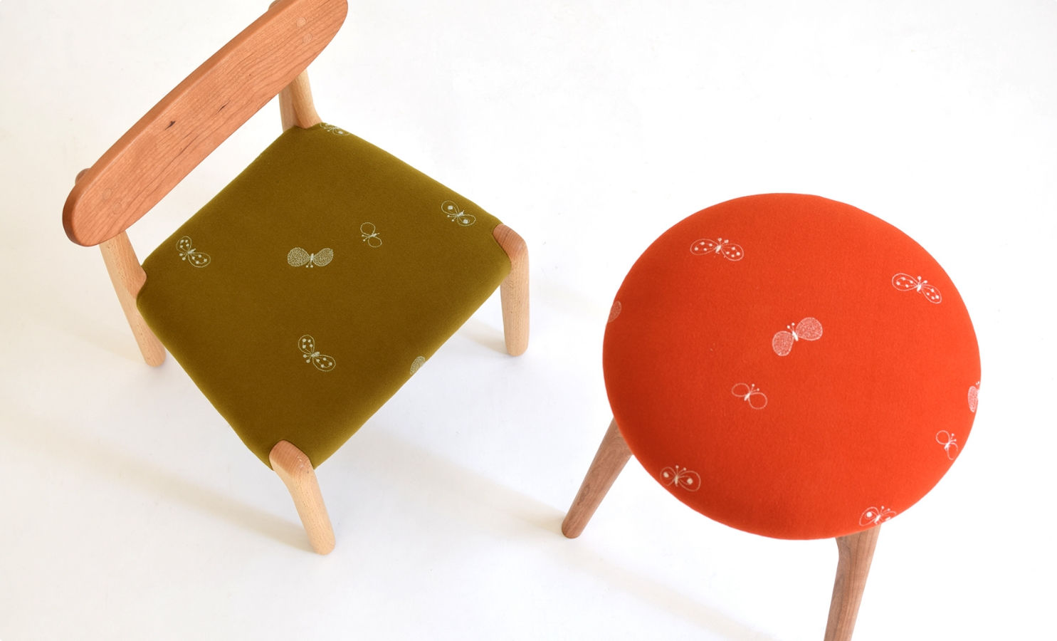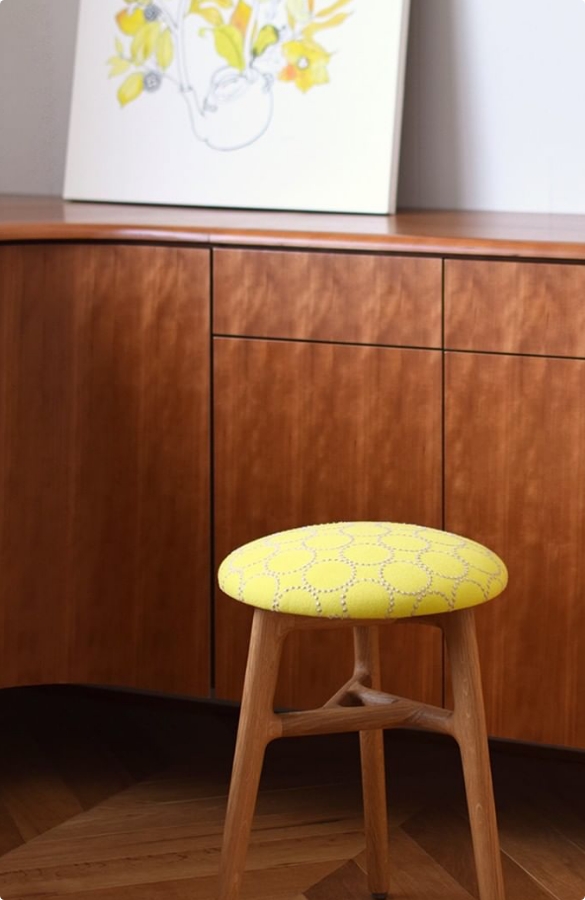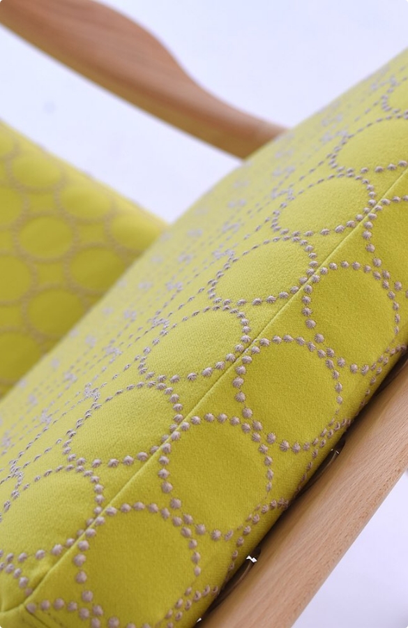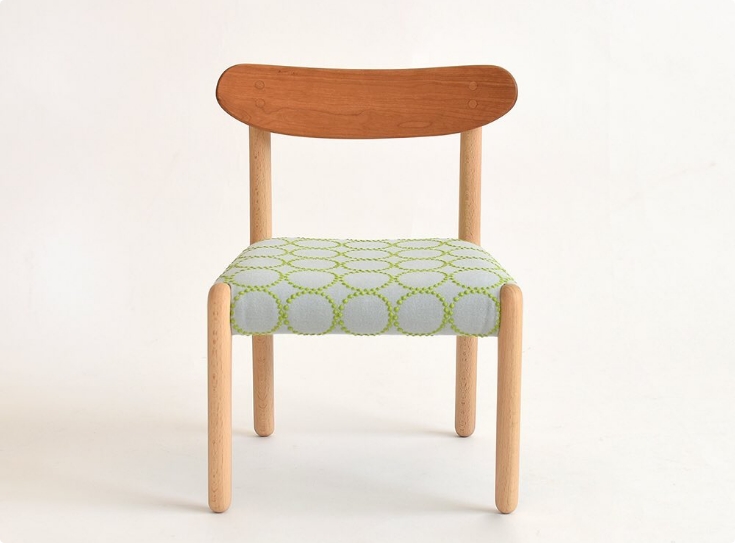 やわらかな風合いの生地のうえでこまやかな刺繍がおどる繊細なファブリックは、無垢の家具に豊かな表情をもたらしてくれます。
