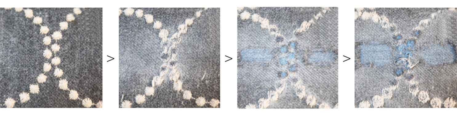 レッドからネイビーが、ブルーからイエローが。一体どのようにして、下に隠れていた色が出てくるのでしょう。使う過程を楽しみ、変化するさまを心待ちにすることができる、木や革と同じような価値がデザインされたファブリック。それは、年月を経るにつれ劣化してしまう従来の生地のあり方とは異なります。