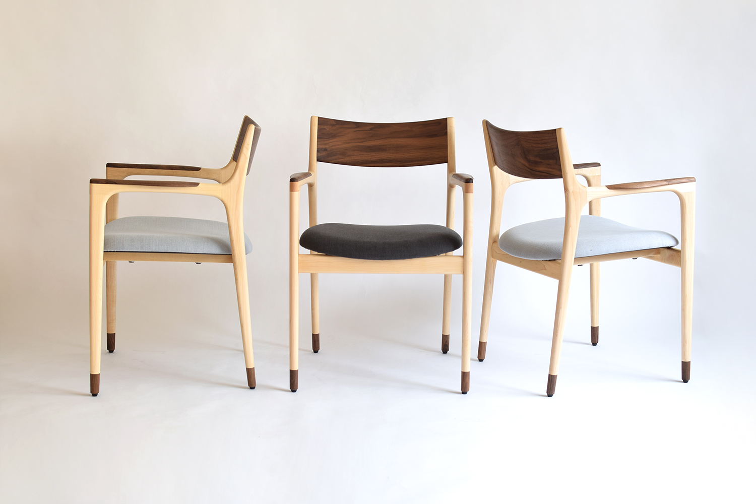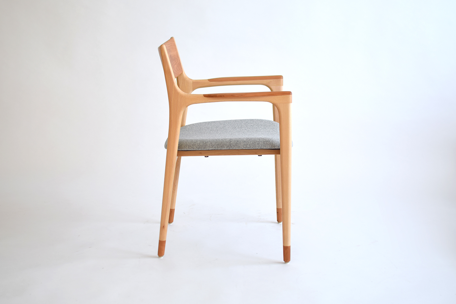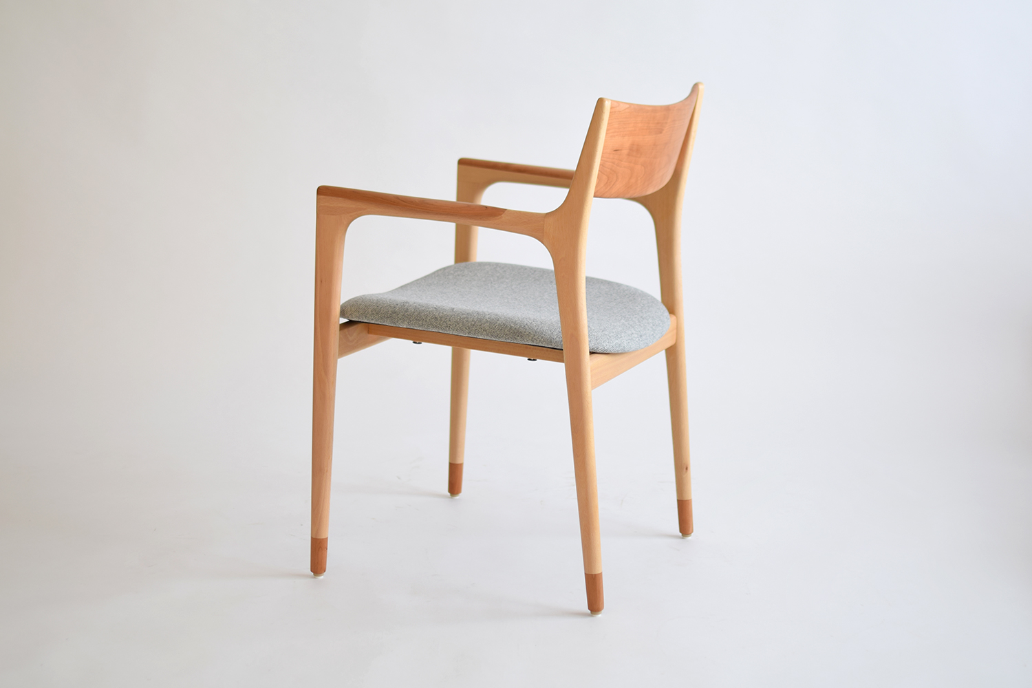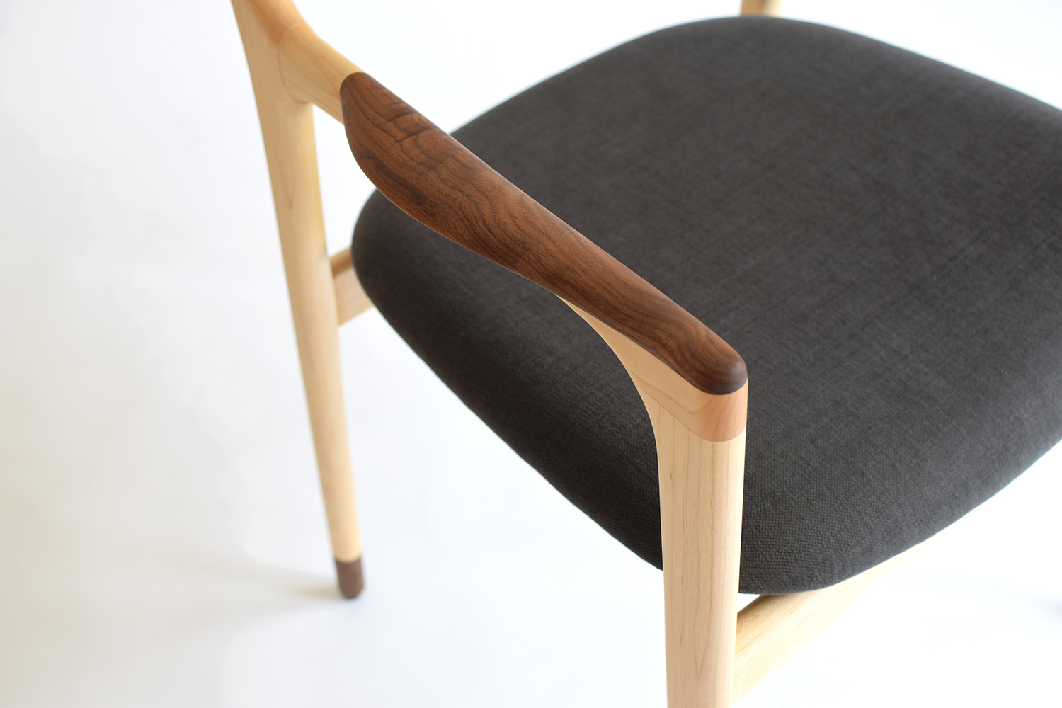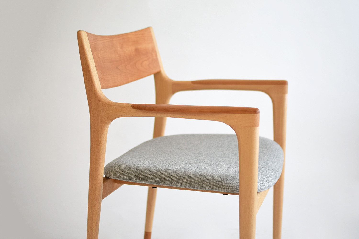 enstolオリジナルのダイニングチェア。 深みのある色の木材を汚れやすいアームや背もたれに配し、優しいカラーの木材をフレームに使用することで、フルアームチェアながらも軽やかな雰囲気に。