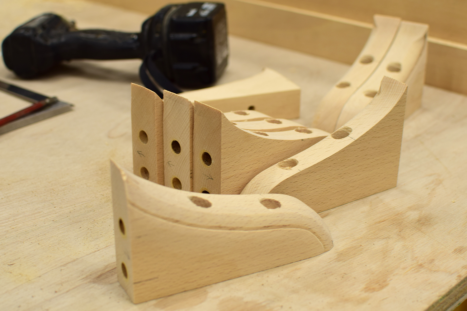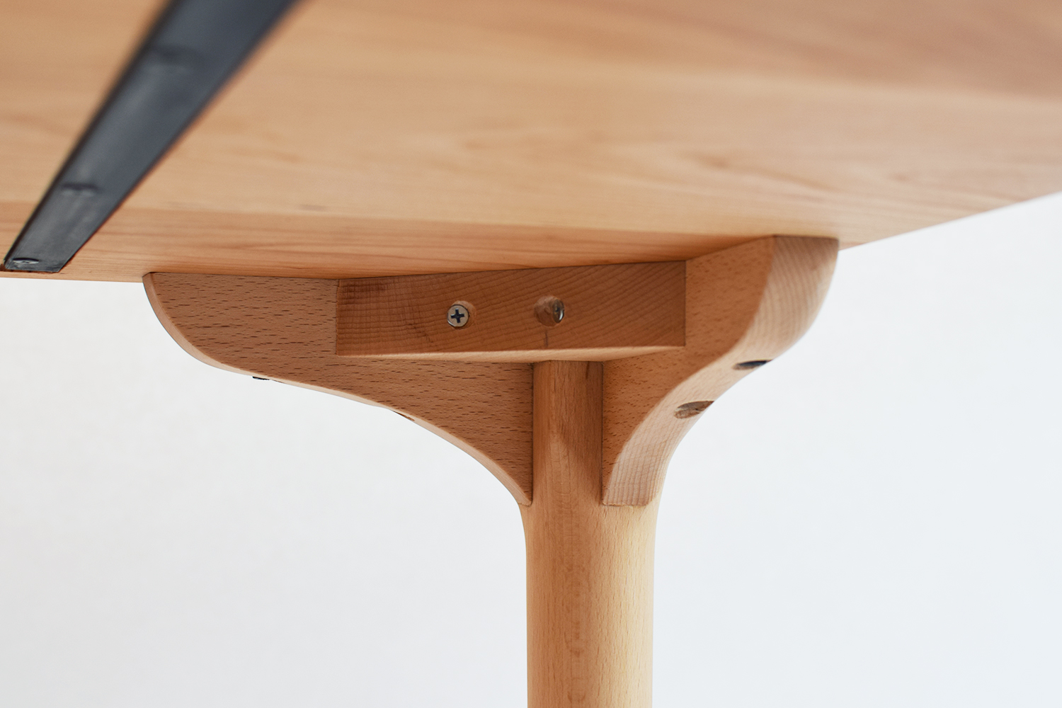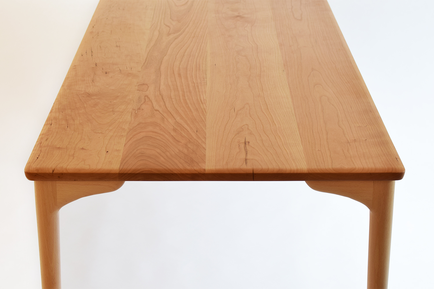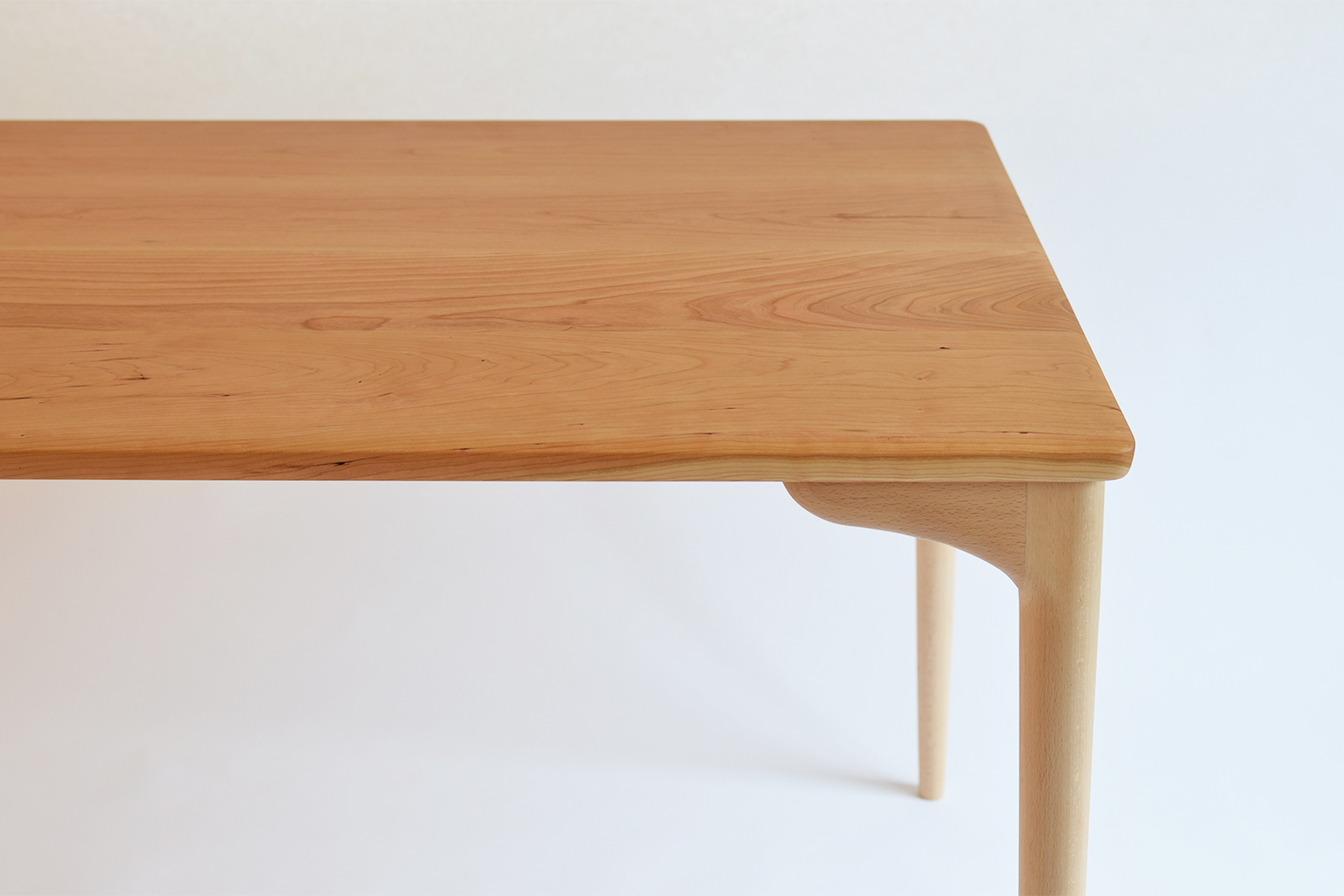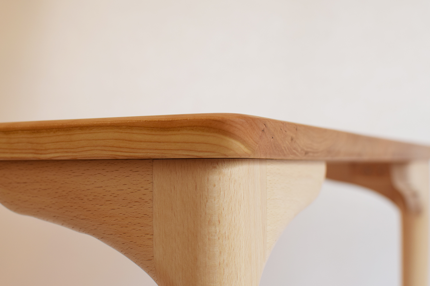 天板を支える幕板のパーツは、ビーチ無垢材を丁寧に磨き上げ、すべすべとした有機的なフォルムに。