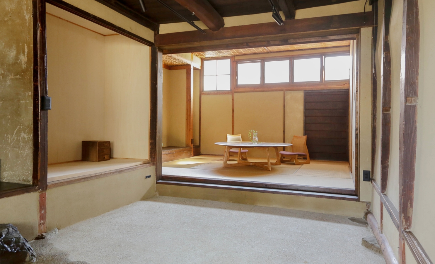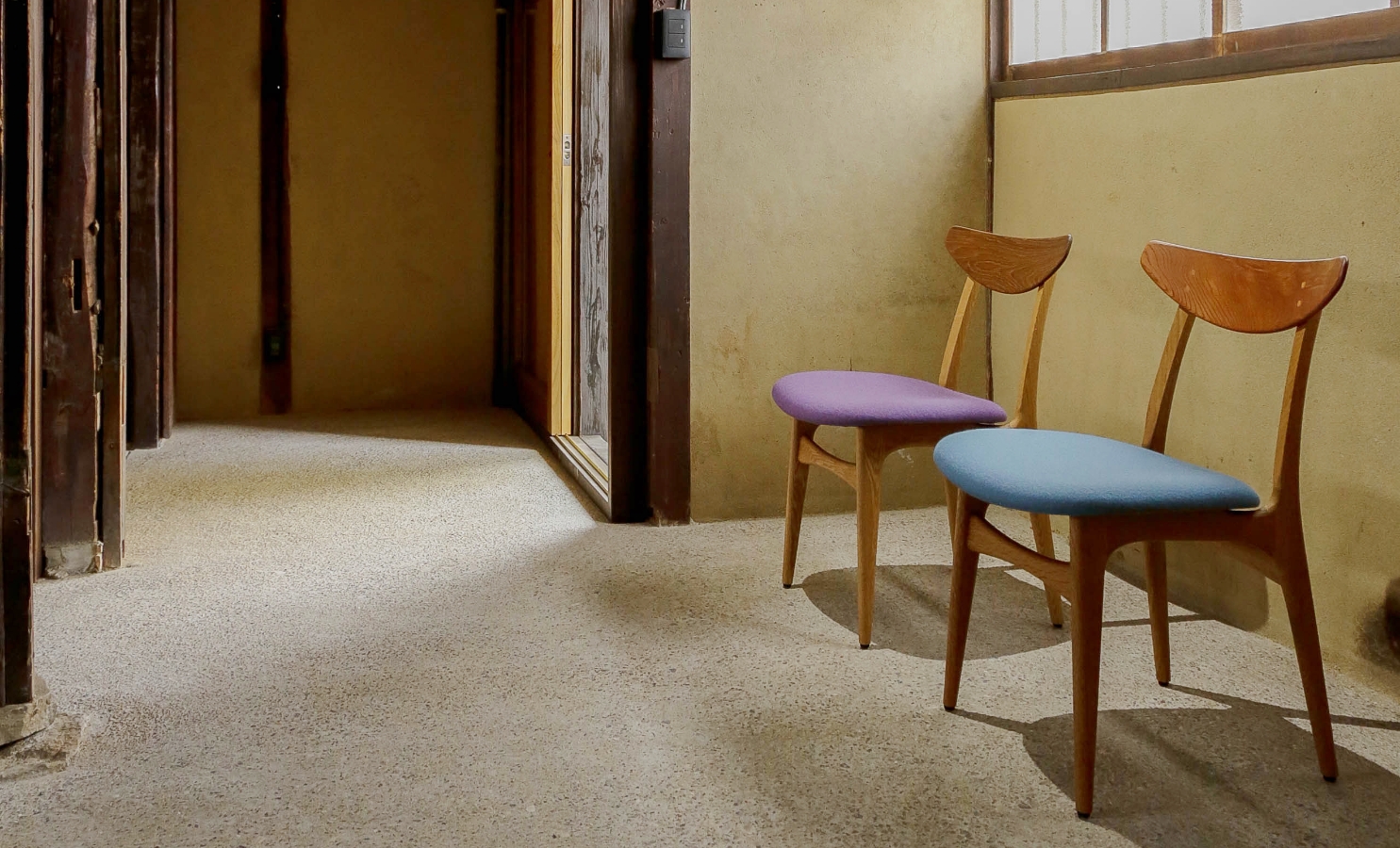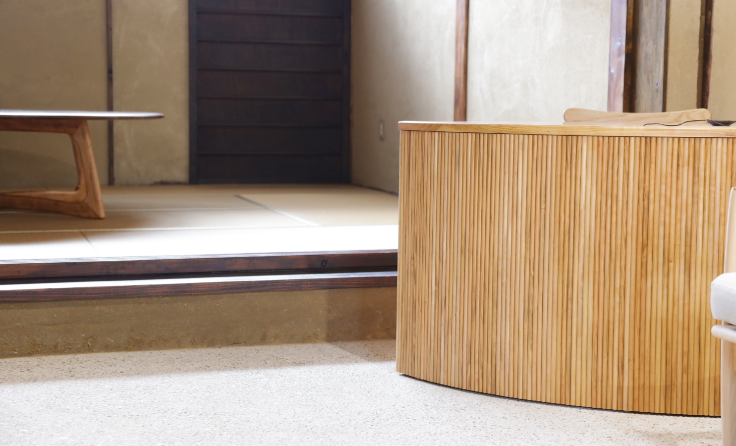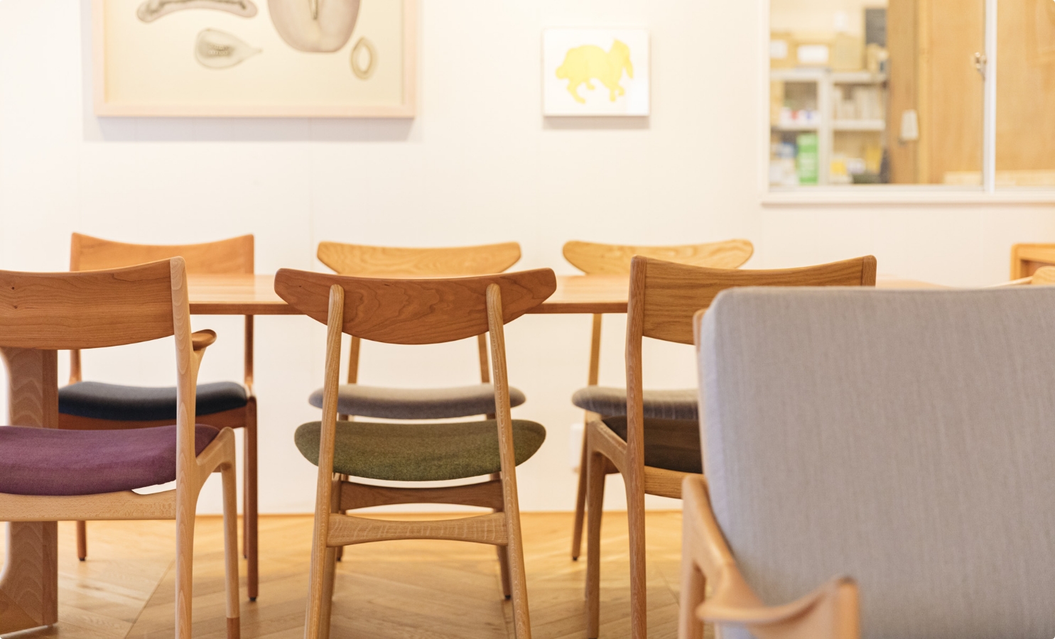窓越しに届くものづくりの音を聞きながら、椅子やソファに座ったり、テーブルに触れたりしていただけます。