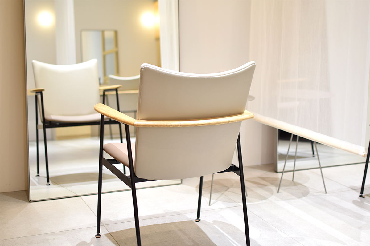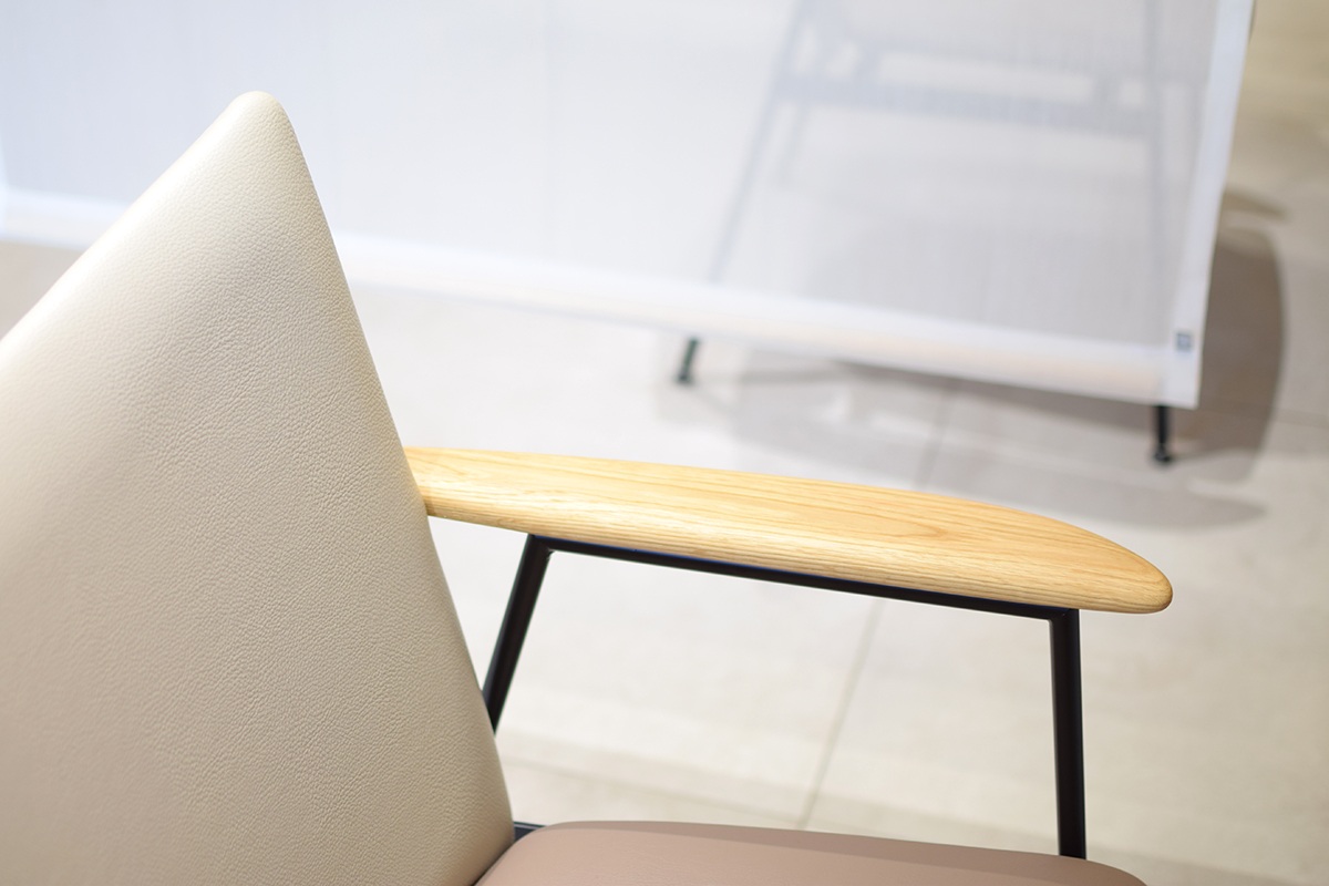 シャープで直線的なラインのアイアンフレームに、木のなめらかな曲線や布地の質感をミックスした、無骨ながらも温もりが感じられる一脚です。