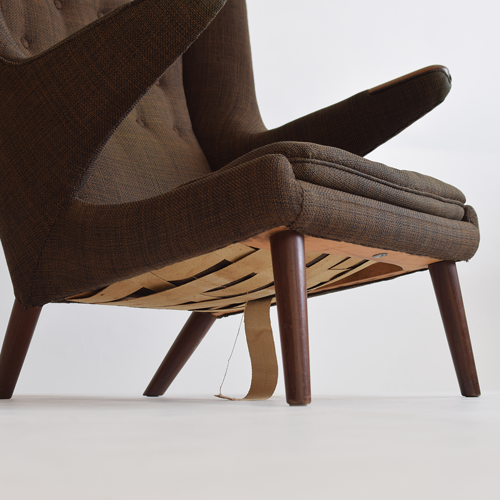 もともとはグリーンのベアチェアで、張り替えるかわりに上からダークブラウンの生地を張ったのかもしれません。