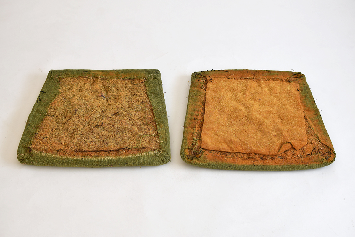座クッションのダークブラウンの生地をはがすと、グリーンの生地が現れました。