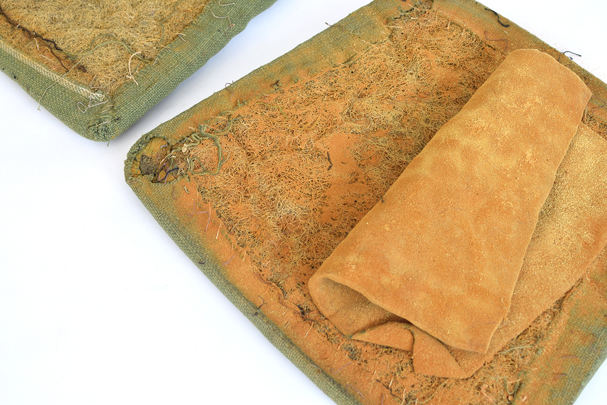 劣化したウレタンが粉状になり、その下には繊維状の詰め物が。