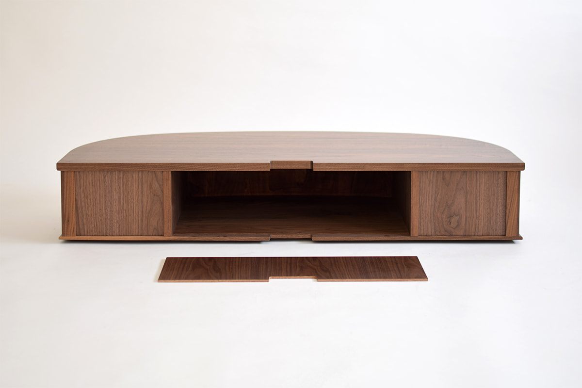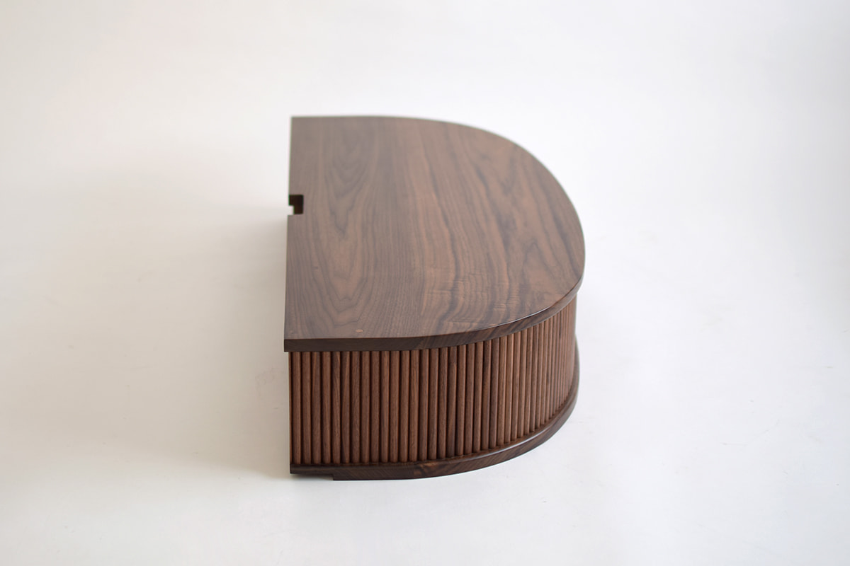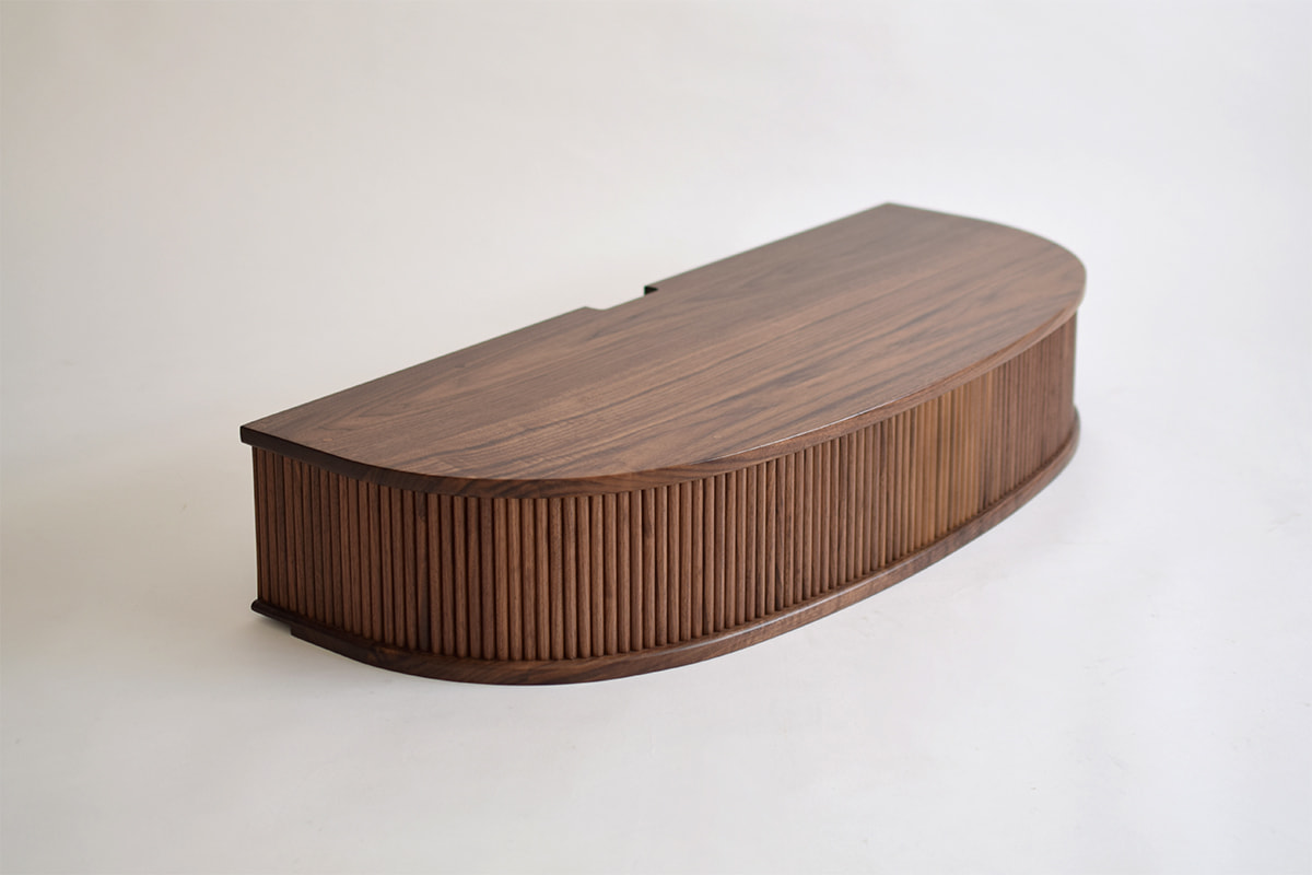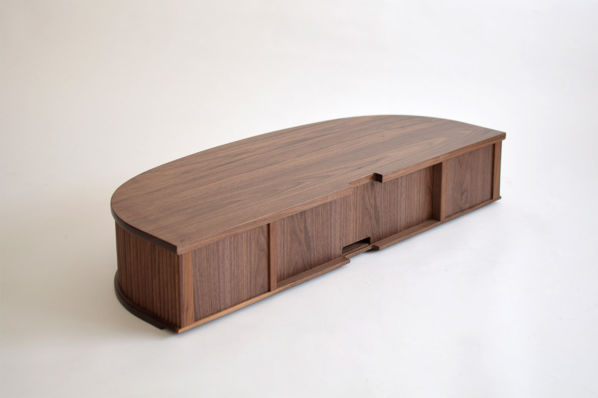 角は足をぶつけても痛くないよう大きく丸みを持たせ、背面下部は畳の縁の分だけ高さを嵩上げしています。