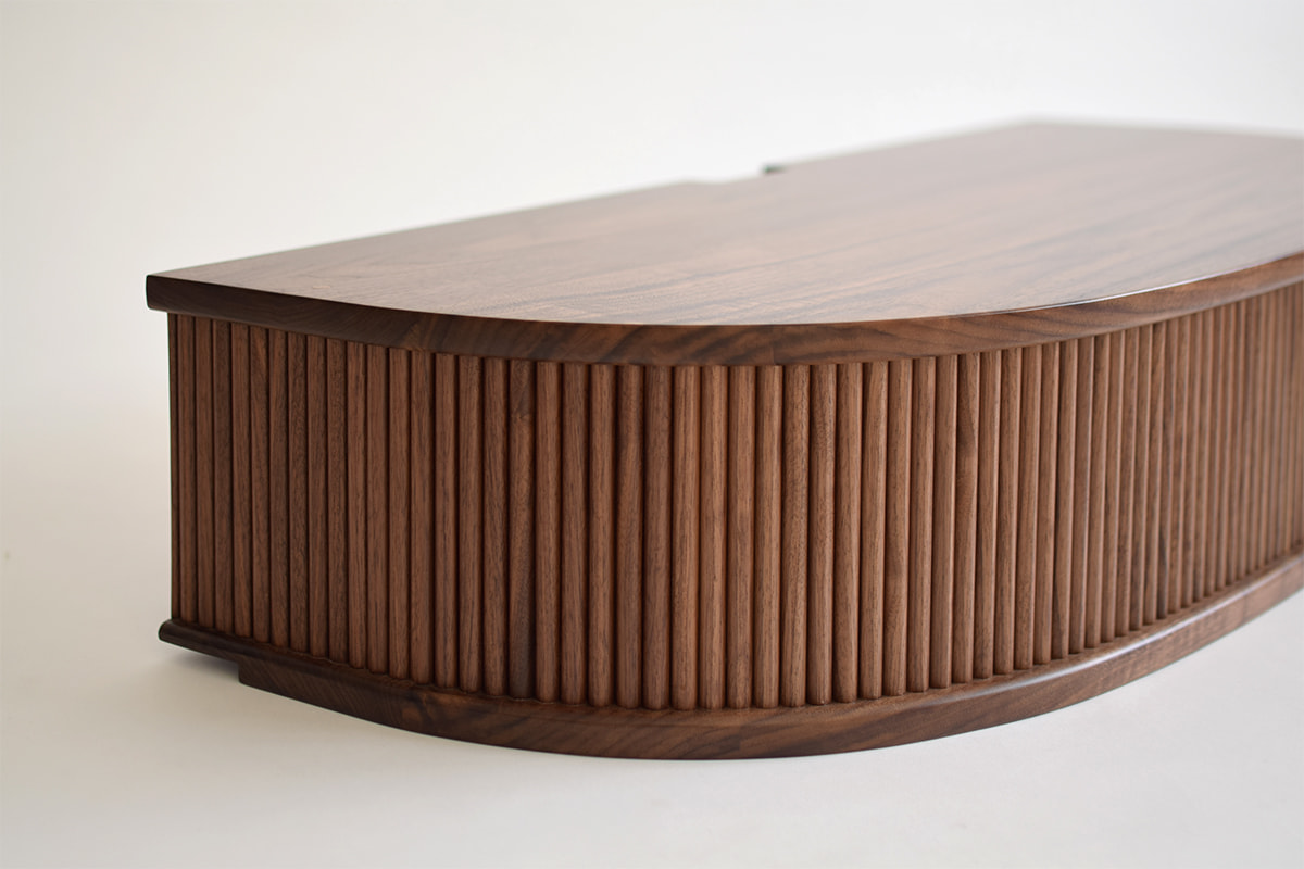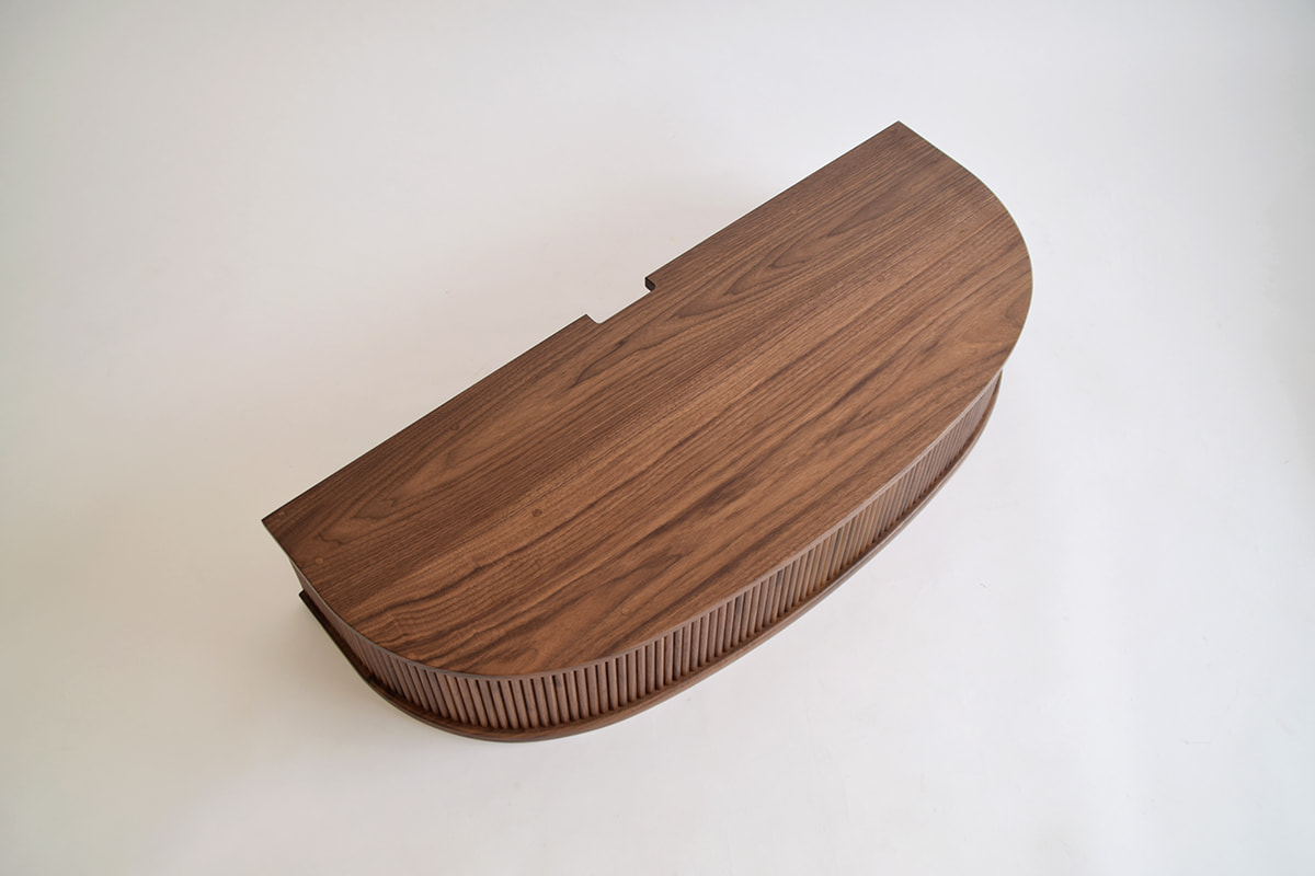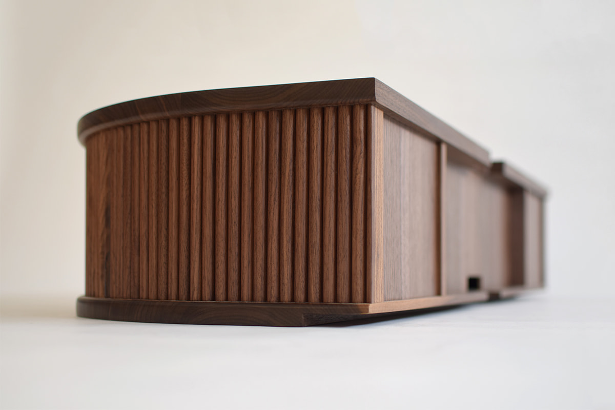 前面にウォールナットの細い丸棒を整然と配置し、蛇腹扉のようなデザインにしました。