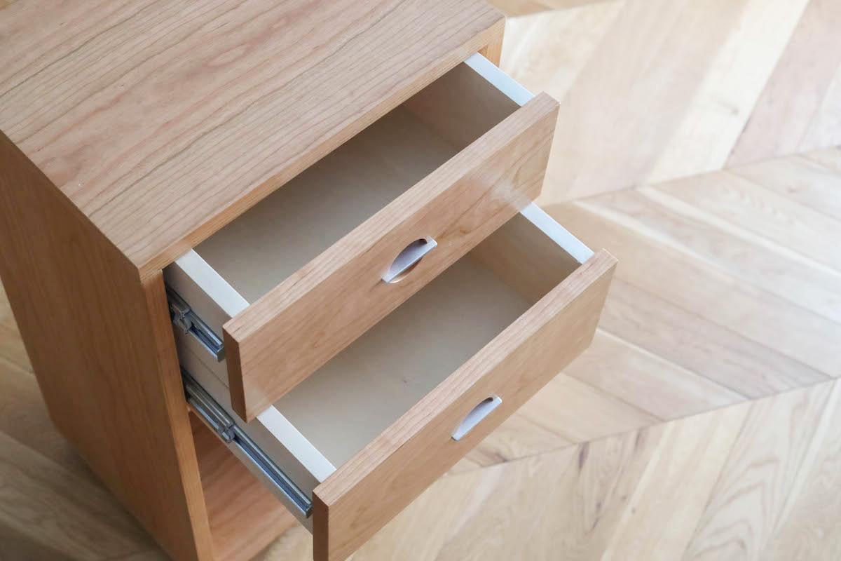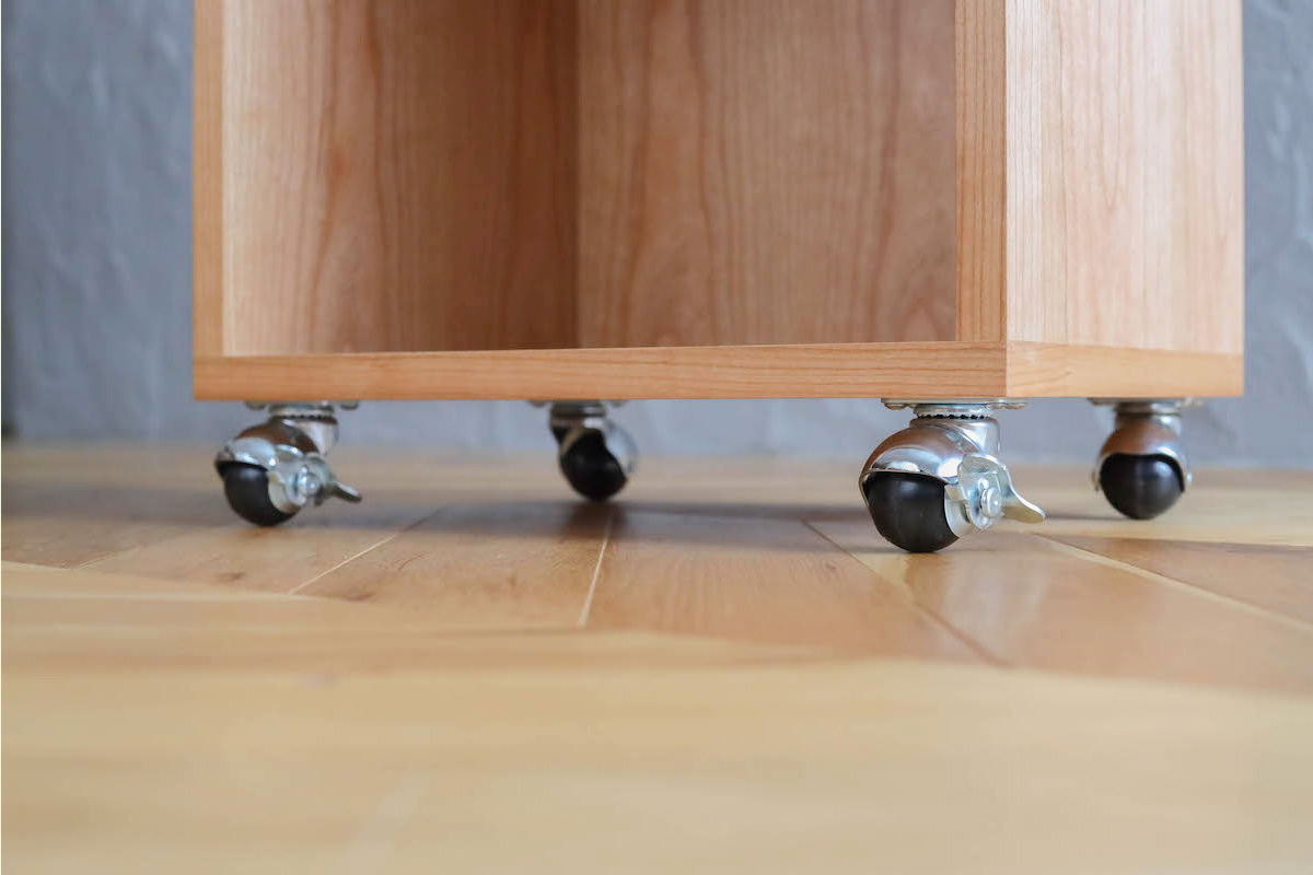 また、デスク下に収まるようワゴンも製作。下段は教科書が入る高さに、キャスターをつけて楽に移動できるように。