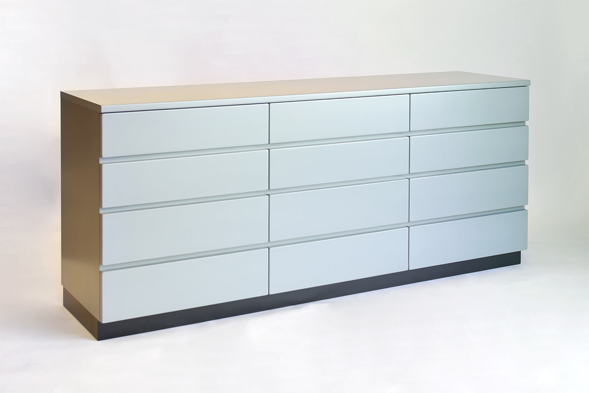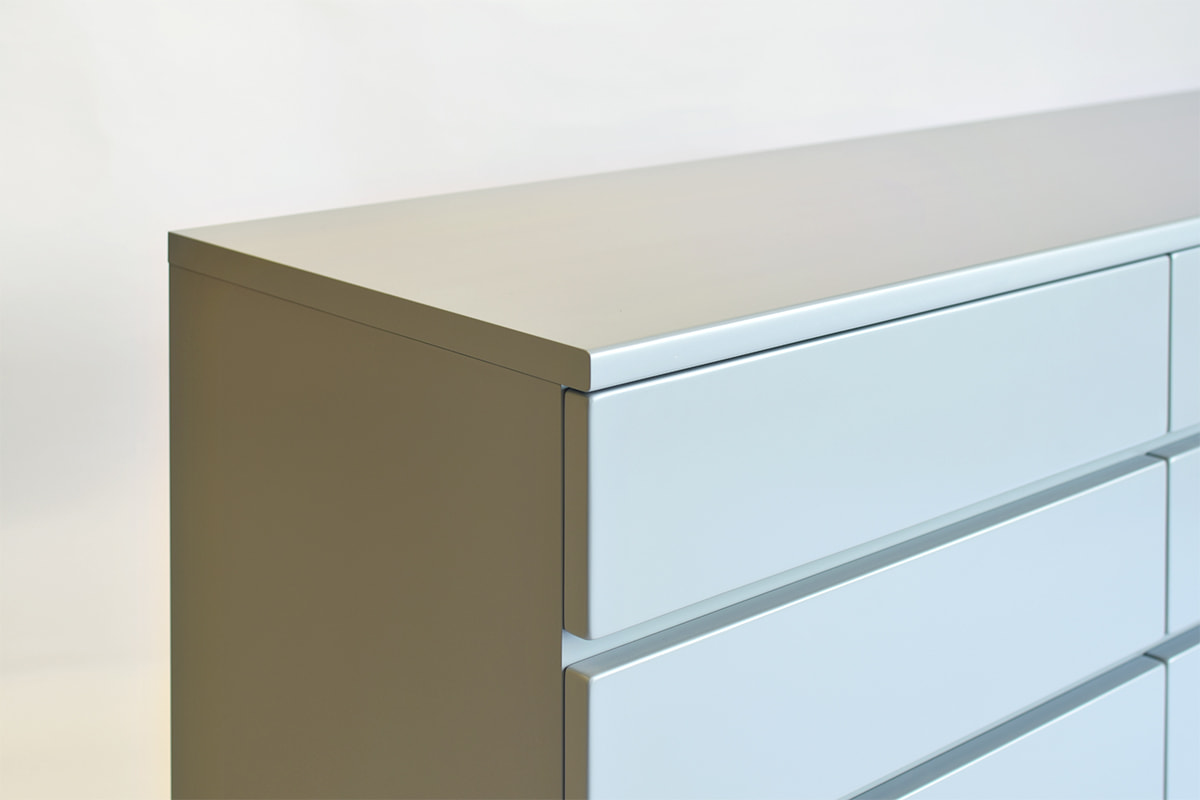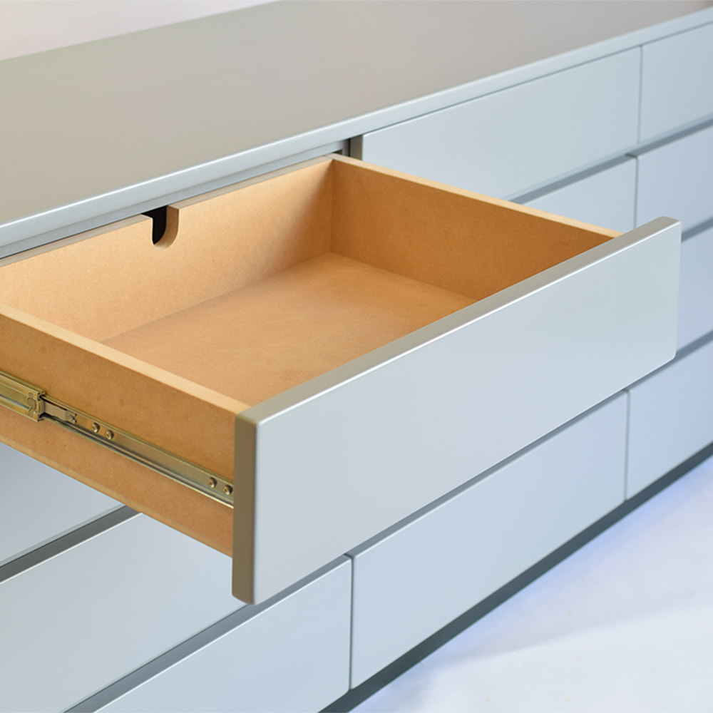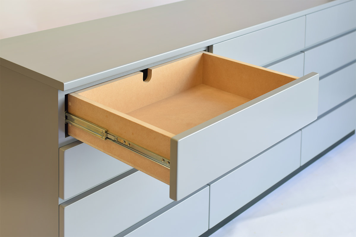 works - 家具の製作/修理・リメイク事例 一覧へ オーダーメイド家具 ライトグレーのキャビネット シンプルなデザインのキャビネット。引き出しは前板の下に手をかけて引き出す仕様に。上段中央の扉のみプッシュオープン仕様になっています。 close