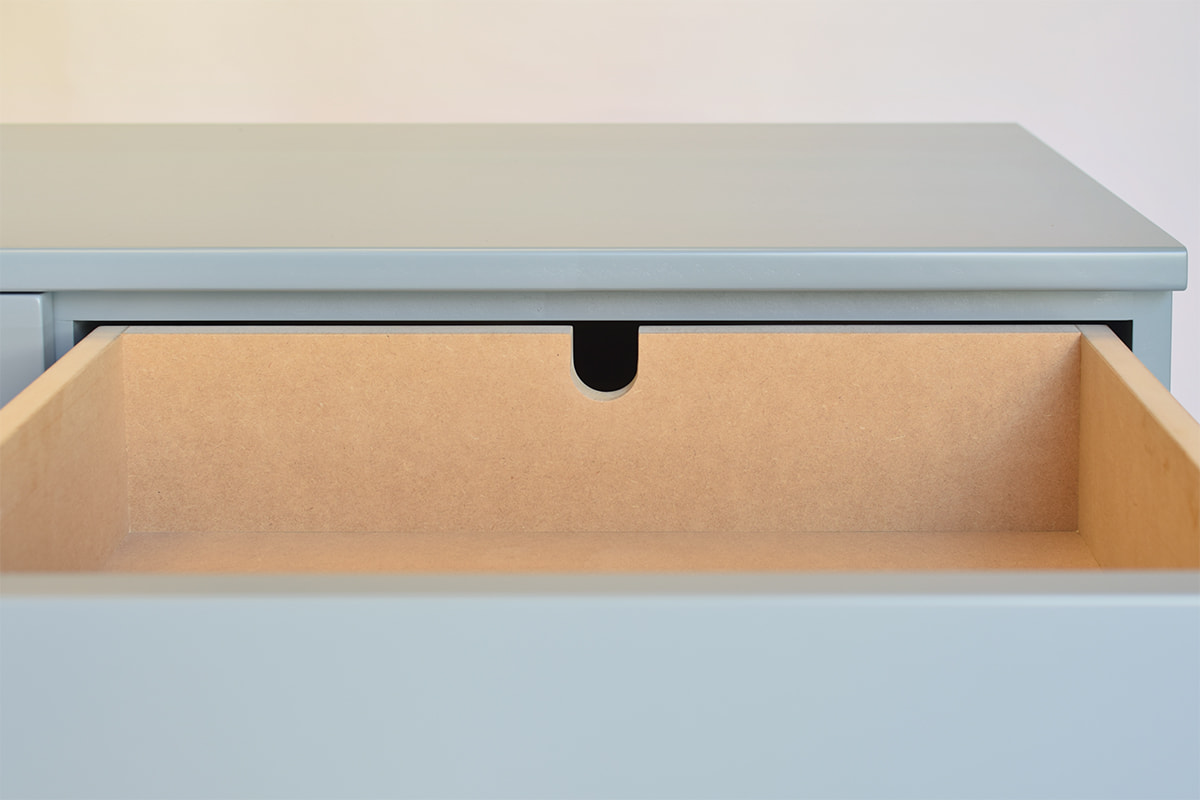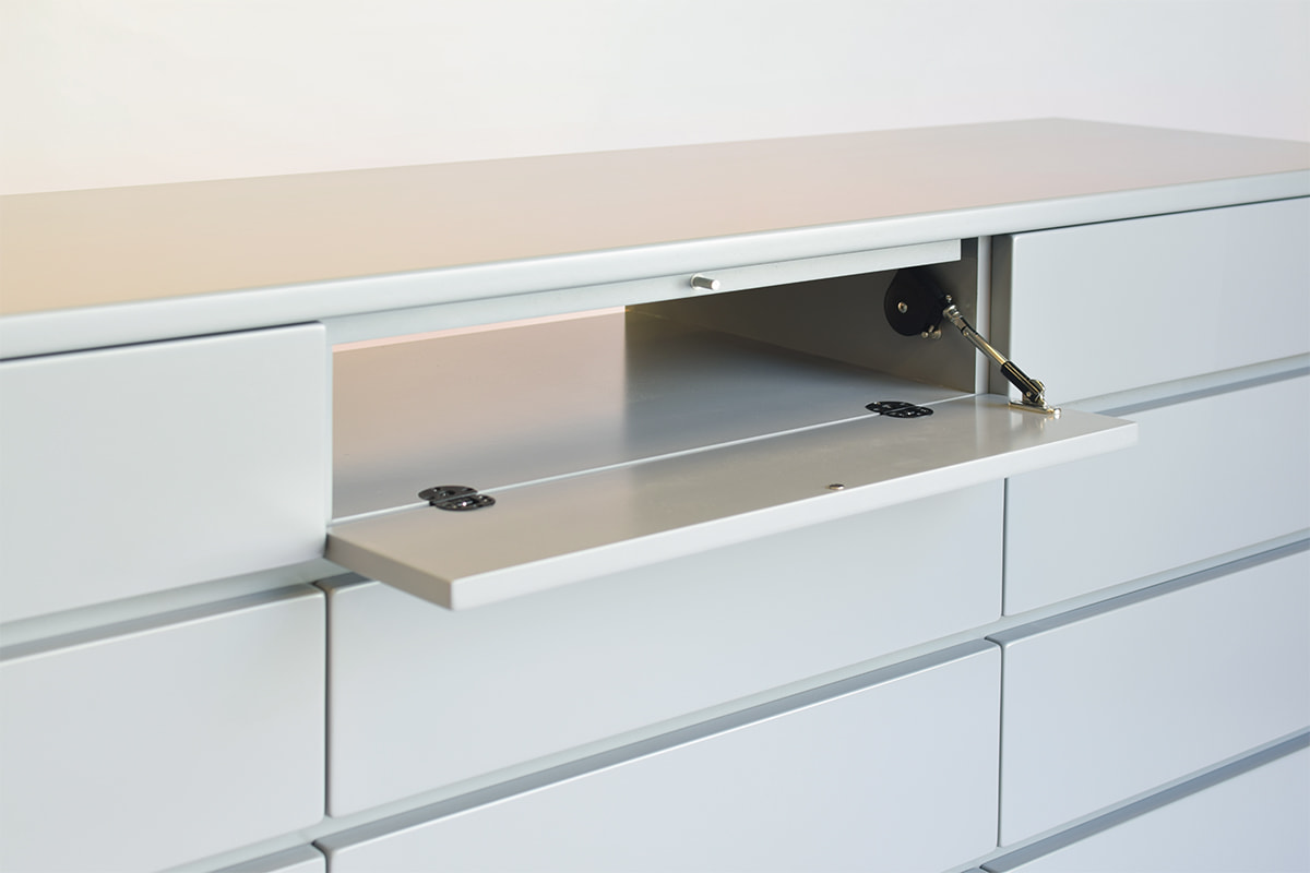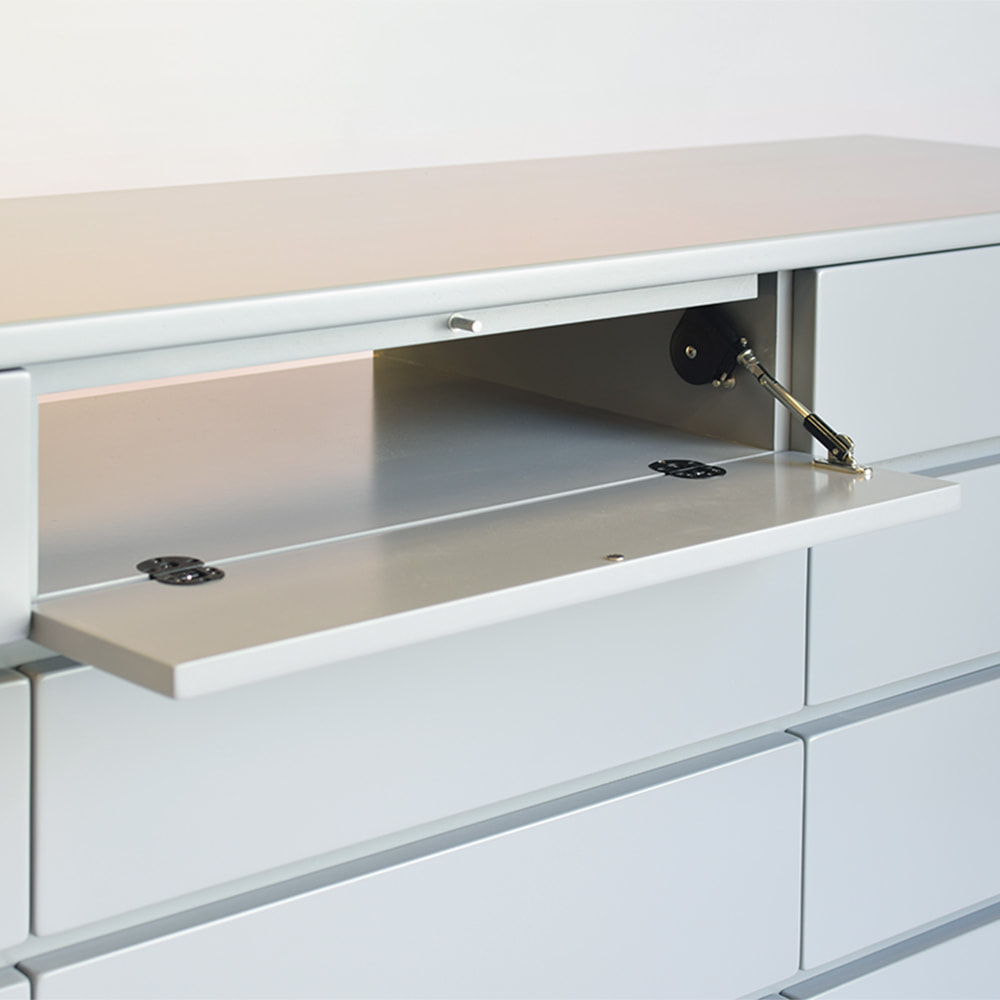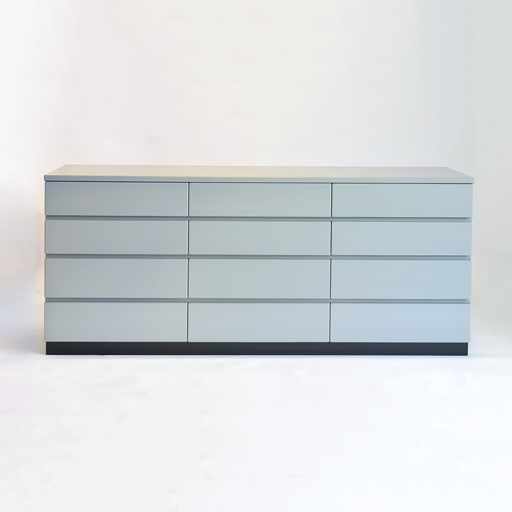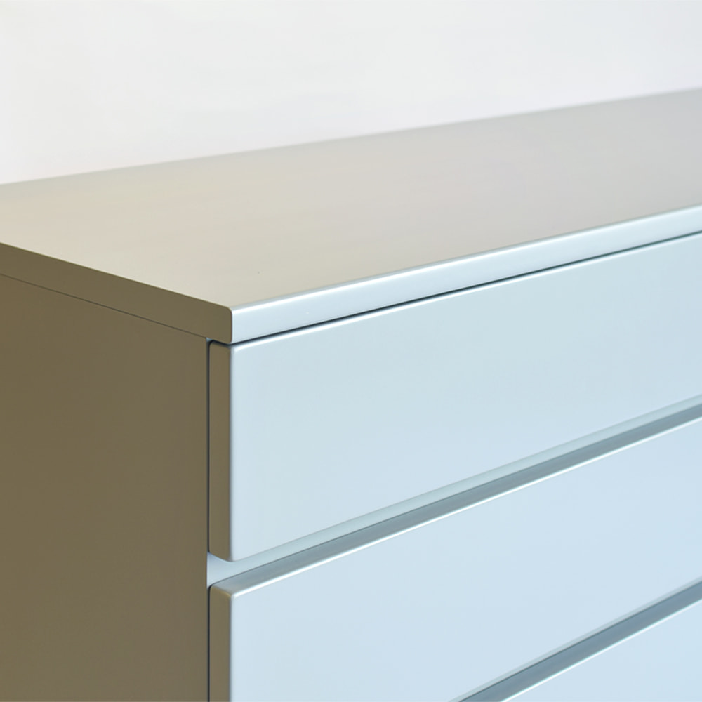 works - 家具の製作/修理・リメイク事例 一覧へ オーダーメイド家具 ライトグレーのキャビネット シンプルなデザインのキャビネット。引き出しは前板の下に手をかけて引き出す仕様に。上段中央の扉のみプッシュオープン仕様になっています。 close