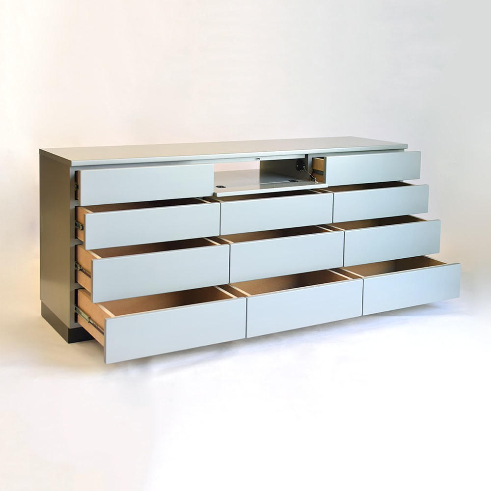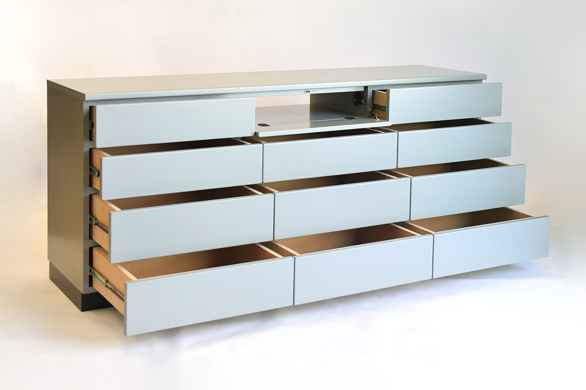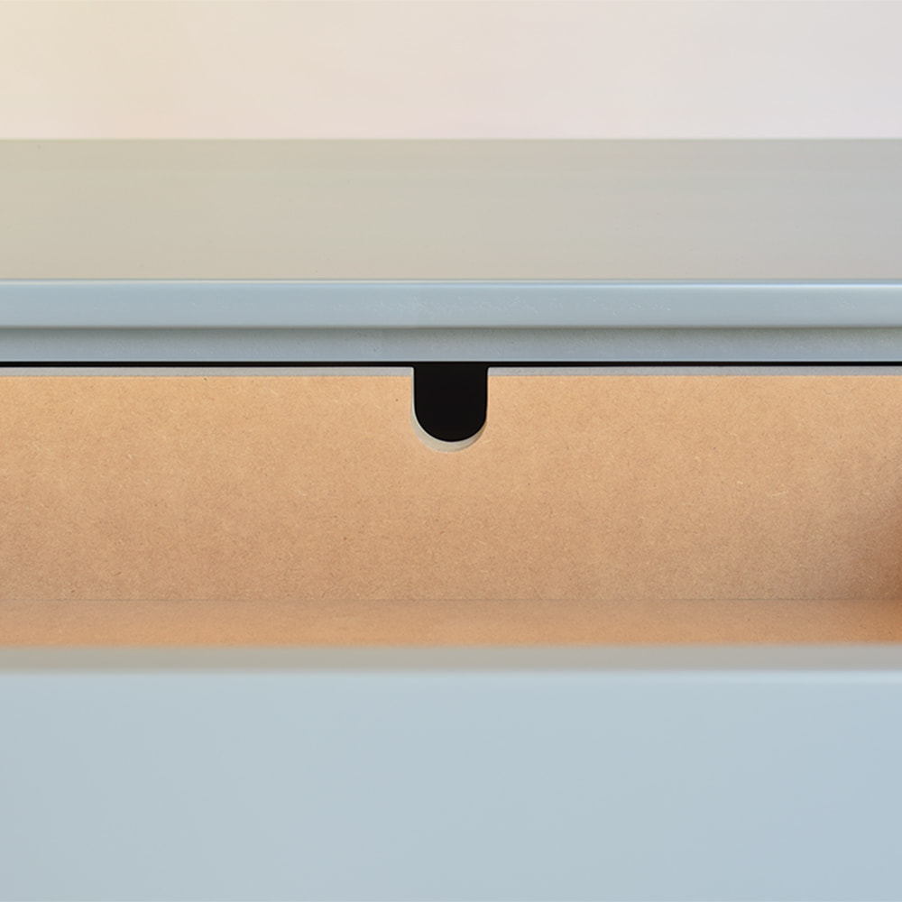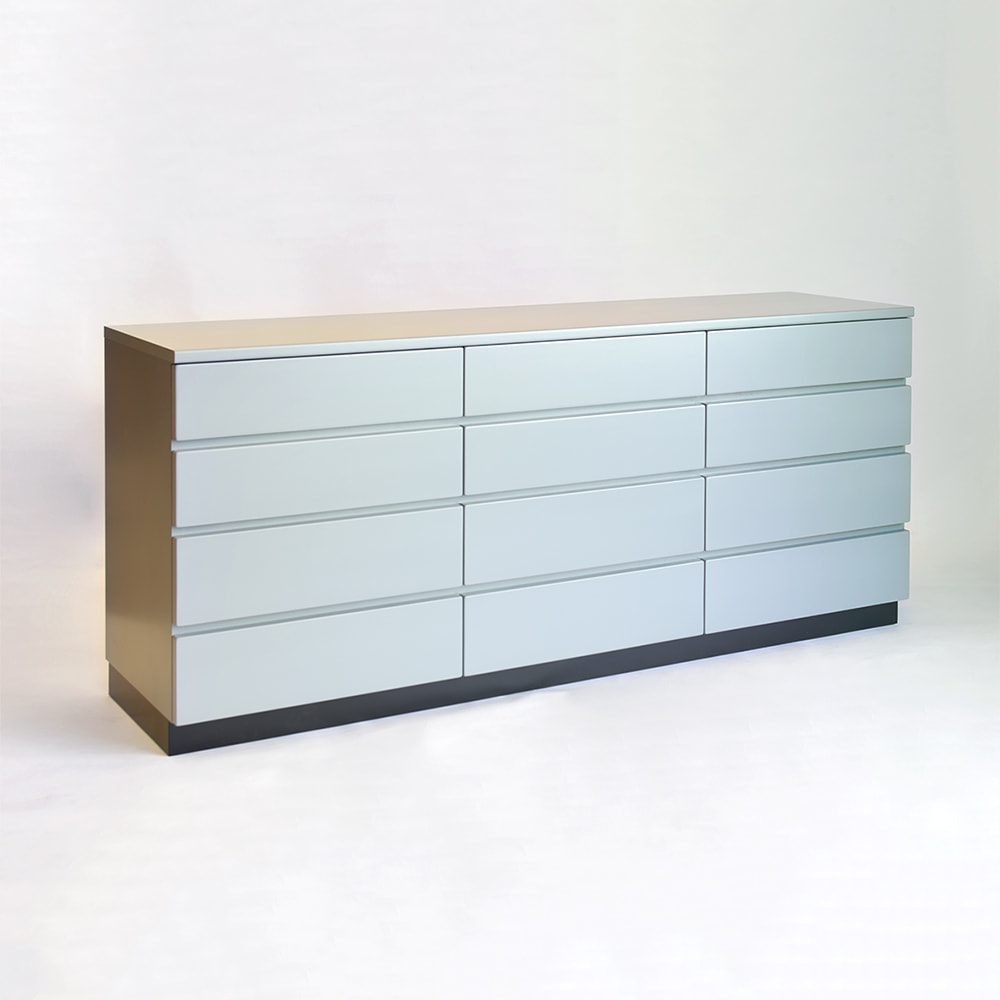 works - 家具の製作/修理・リメイク事例 一覧へ オーダーメイド家具 ライトグレーのキャビネット シンプルなデザインのキャビネット。引き出しは前板の下に手をかけて引き出す仕様に。上段中央の扉のみプッシュオープン仕様になっています。 close