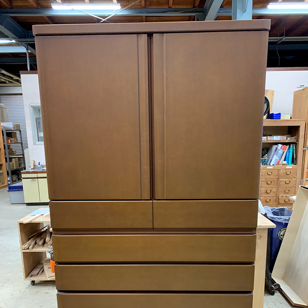 本棚の天板・ひきだし底板の割れ部分埋め、ひきだし・扉の開閉調整