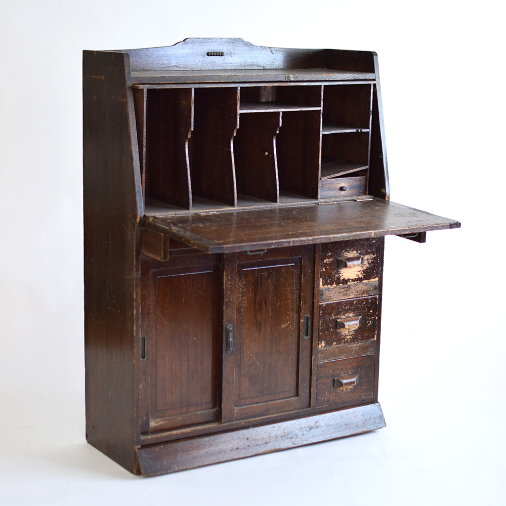 ライティングビューローの台輪取付、蝶番・金物取付、オープンラックの棚板取付、土台・背板補強、全体塗装補修