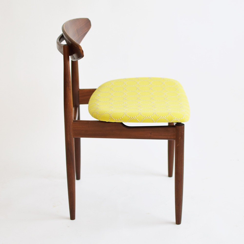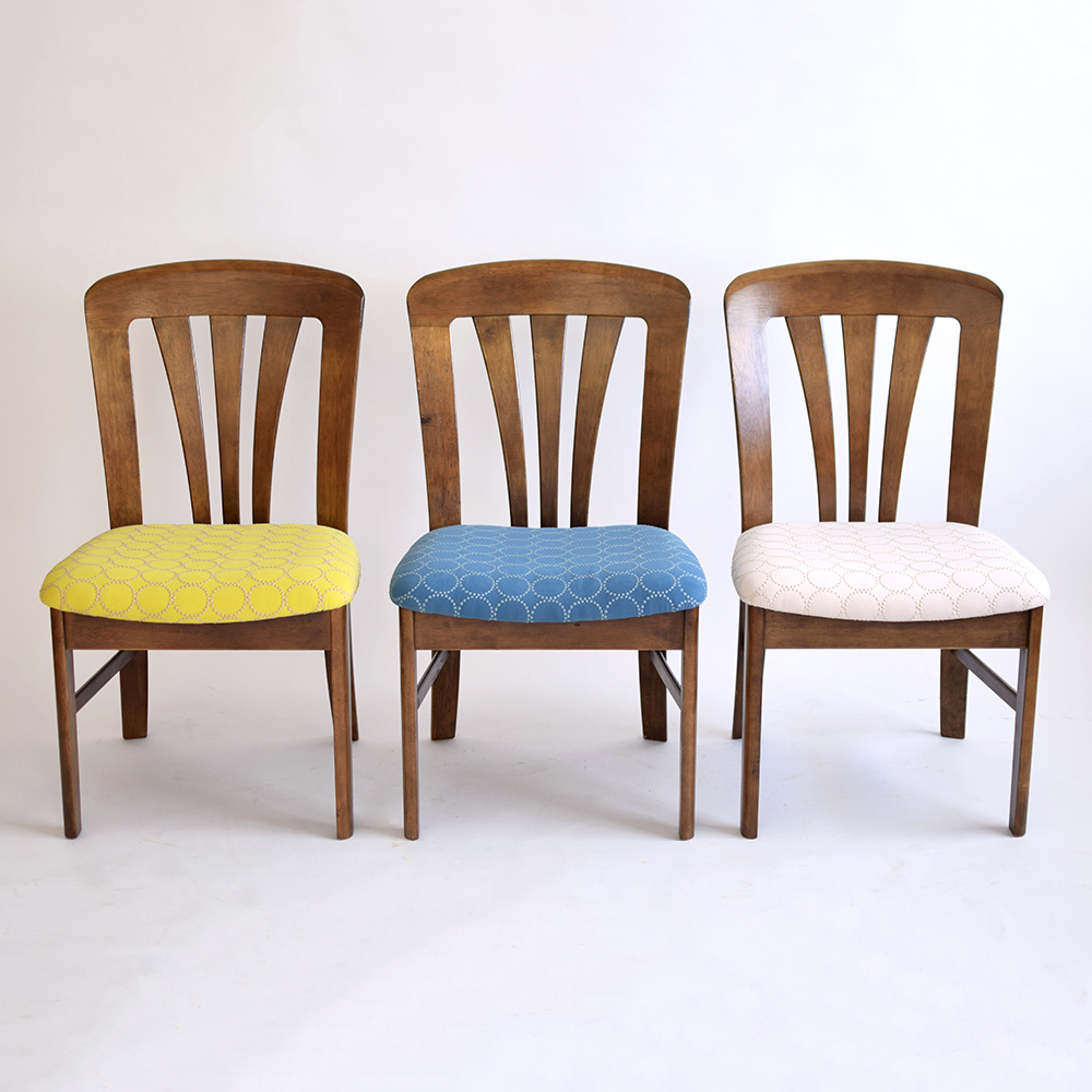 カリモク製ダイニングチェアの座面張り替え(張地左から:mina/if1066・if1078・if1075)