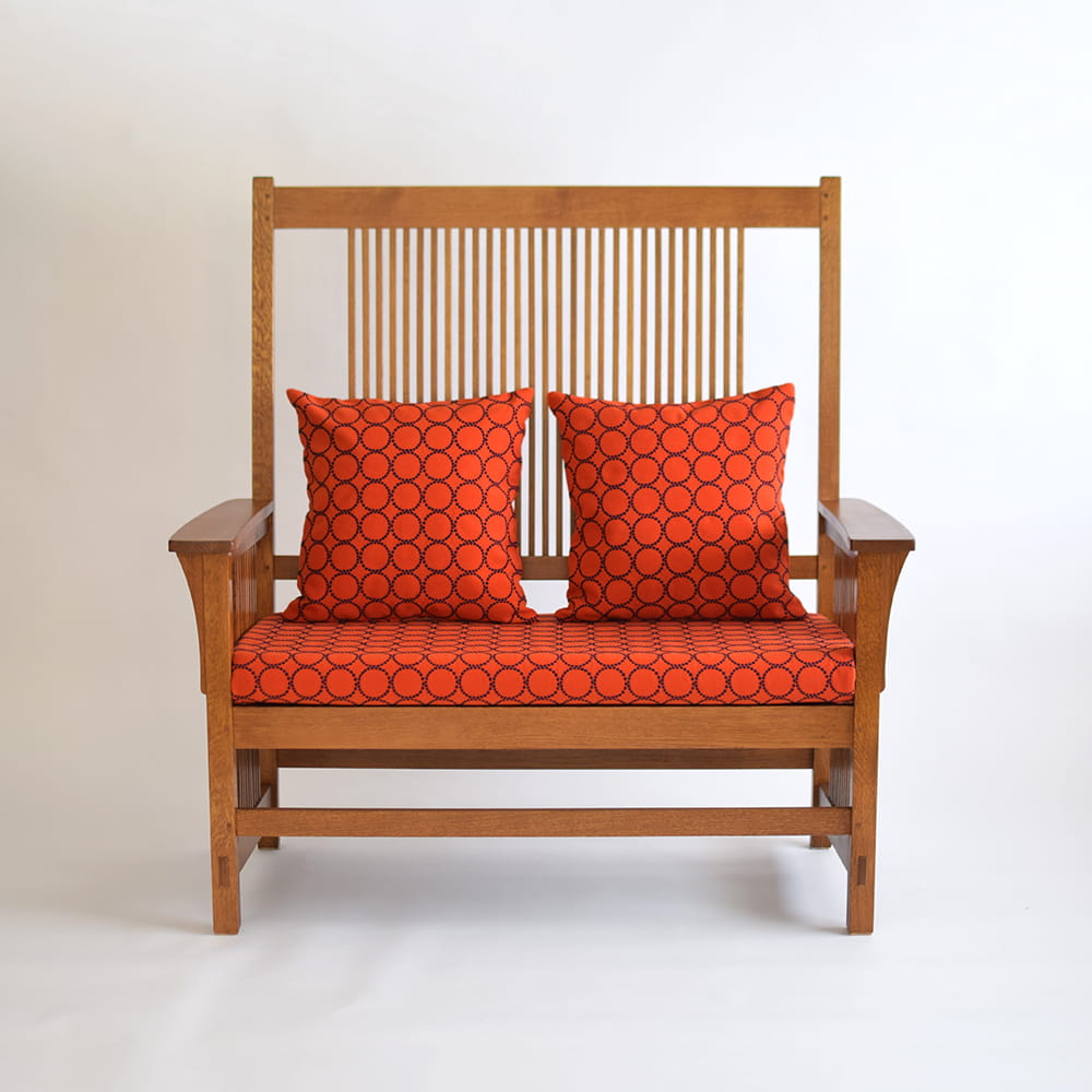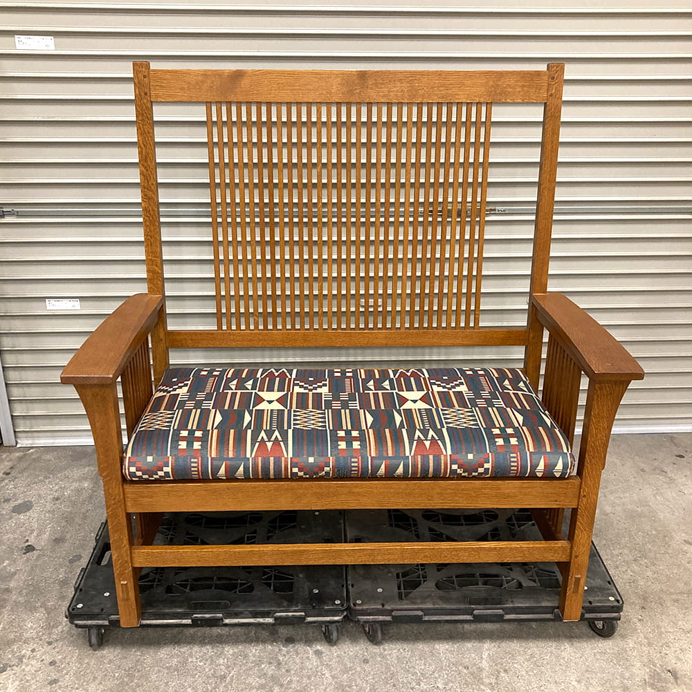 長椅子の座面と座板生地のをミナペルホネン生地で張り替え、クッションカバー製作、色剥げ部分の着色補修
